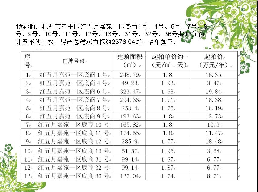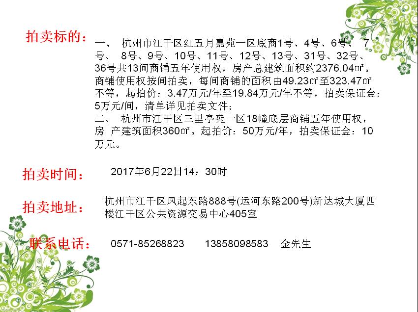 江干區紅五月嘉苑、三里亭苑商鋪使用權轉讓拍賣