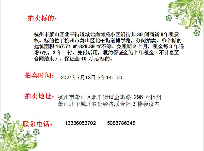 2、競買人請于拍賣會開始前(713日下午1350)到杭州市蕭山區北干街道金惠路296號杭州蕭山北干城北股份經濟聯合社3樓會議室,憑競買證、保證金收據及本人身份證(原件)辦理競買手續(一位競買人限帶一人進入拍賣會現場)。
